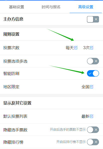 高级设置选项里面,最主要是设置投票规则及防刷机制,投票规则设置好每天可投票次数(这里是代表每个用户每天可投票次数),可以设置单选或者多选(自定义设置多选个数)。把智能防刷按钮打开,相当于给投票活动上了一个安全锁,