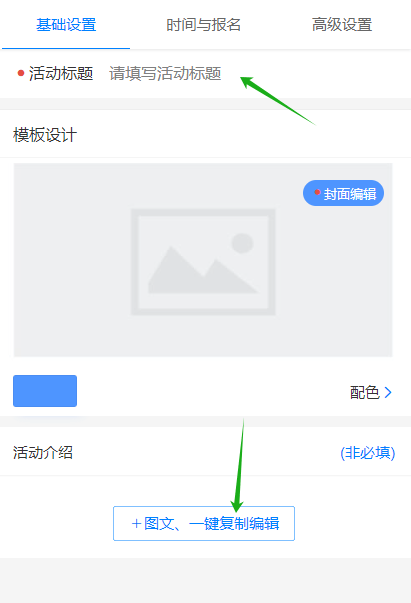 按提示来填写投票内容,在基础设置里面只需要填写活动标题、上传封面图片,在活动介绍里面用几句话说明一下活动规则及制度。设置投票起止时间,还可以自定义设置是否需要分组投票及开放报名投票设置。